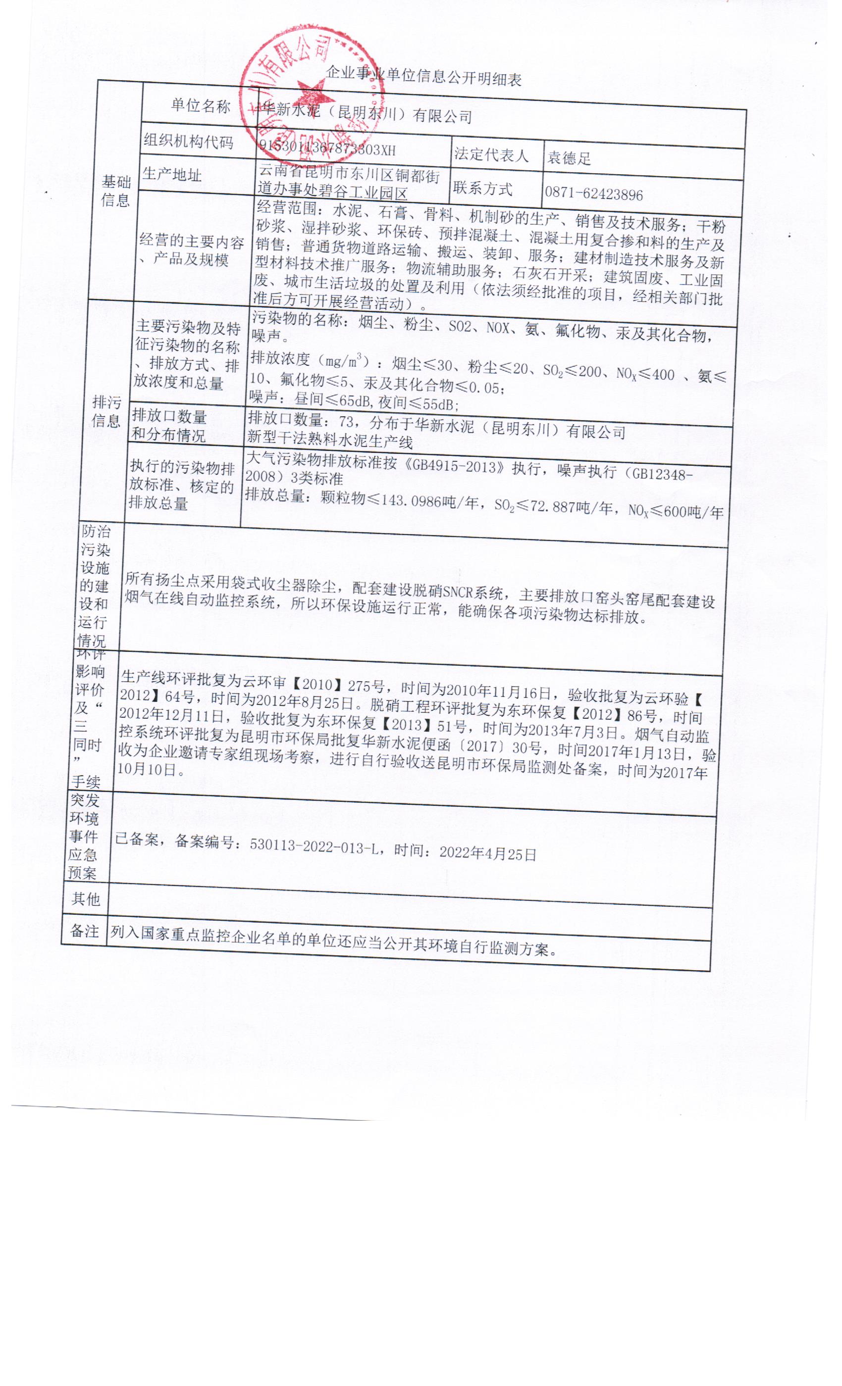 1、华新水泥(昆明东川)有限公司环境信息公示明细表