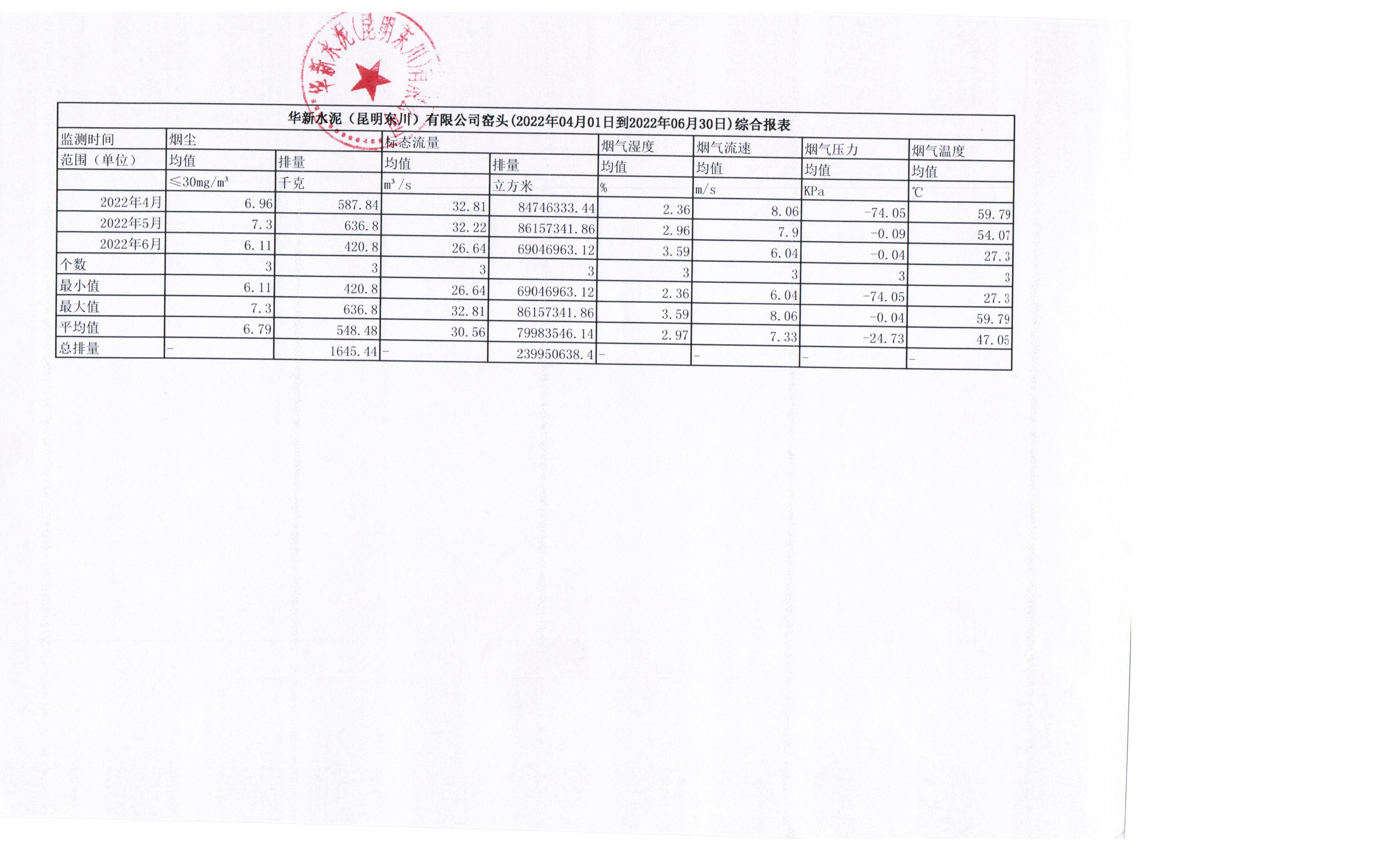 3、华新水泥(昆明东川)有限公司2022年第二季度窑头烟气在线监测月平均值季报表
