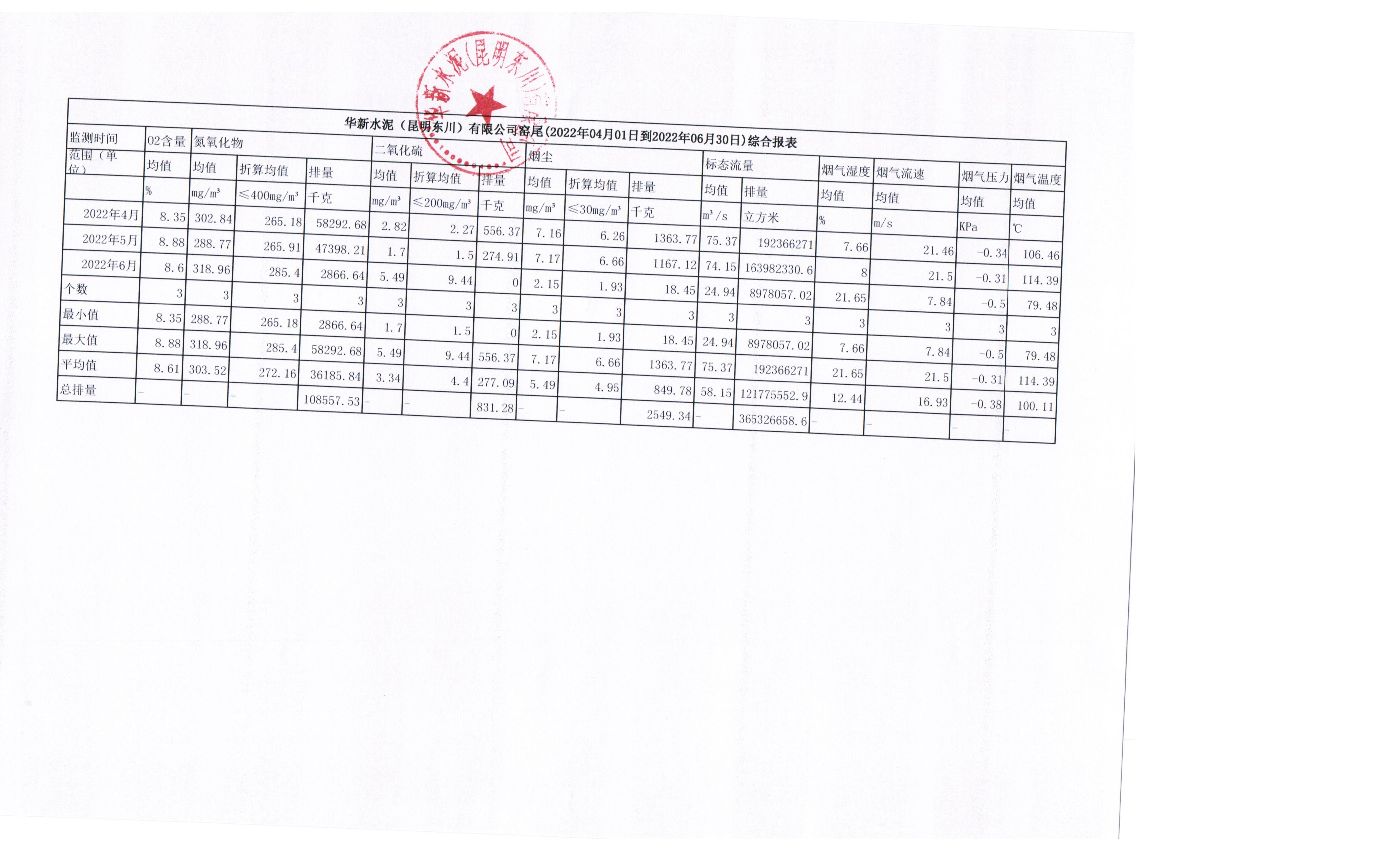 4、华新水泥(昆明东川)有限公司2022年第二季度窑尾烟气在线监测月平均值季报表
